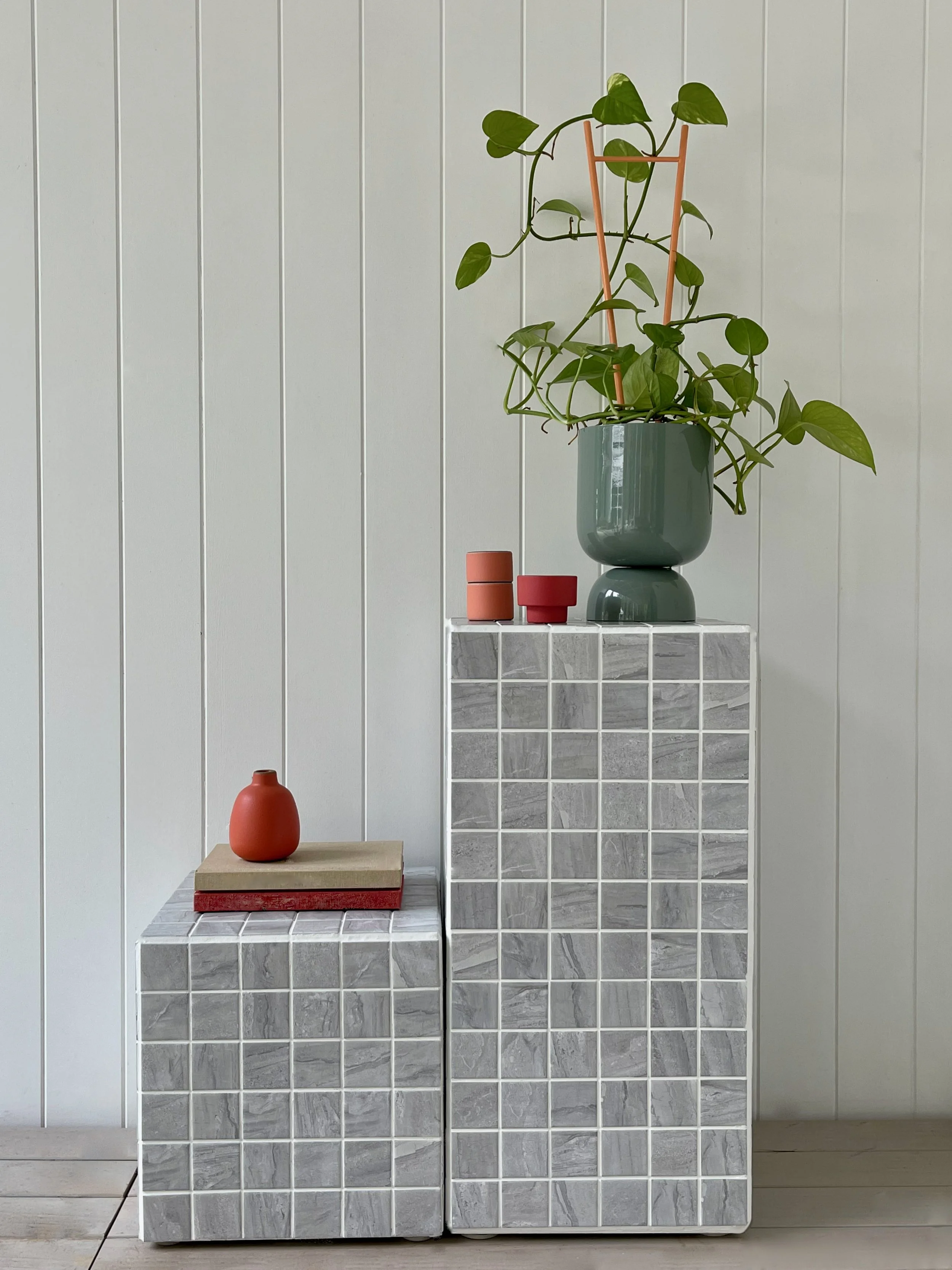 Tile-clad furniture is resilient, easy to clean and right on trend! So I made this matching plinth and cube as pieces that can be used inside and out.