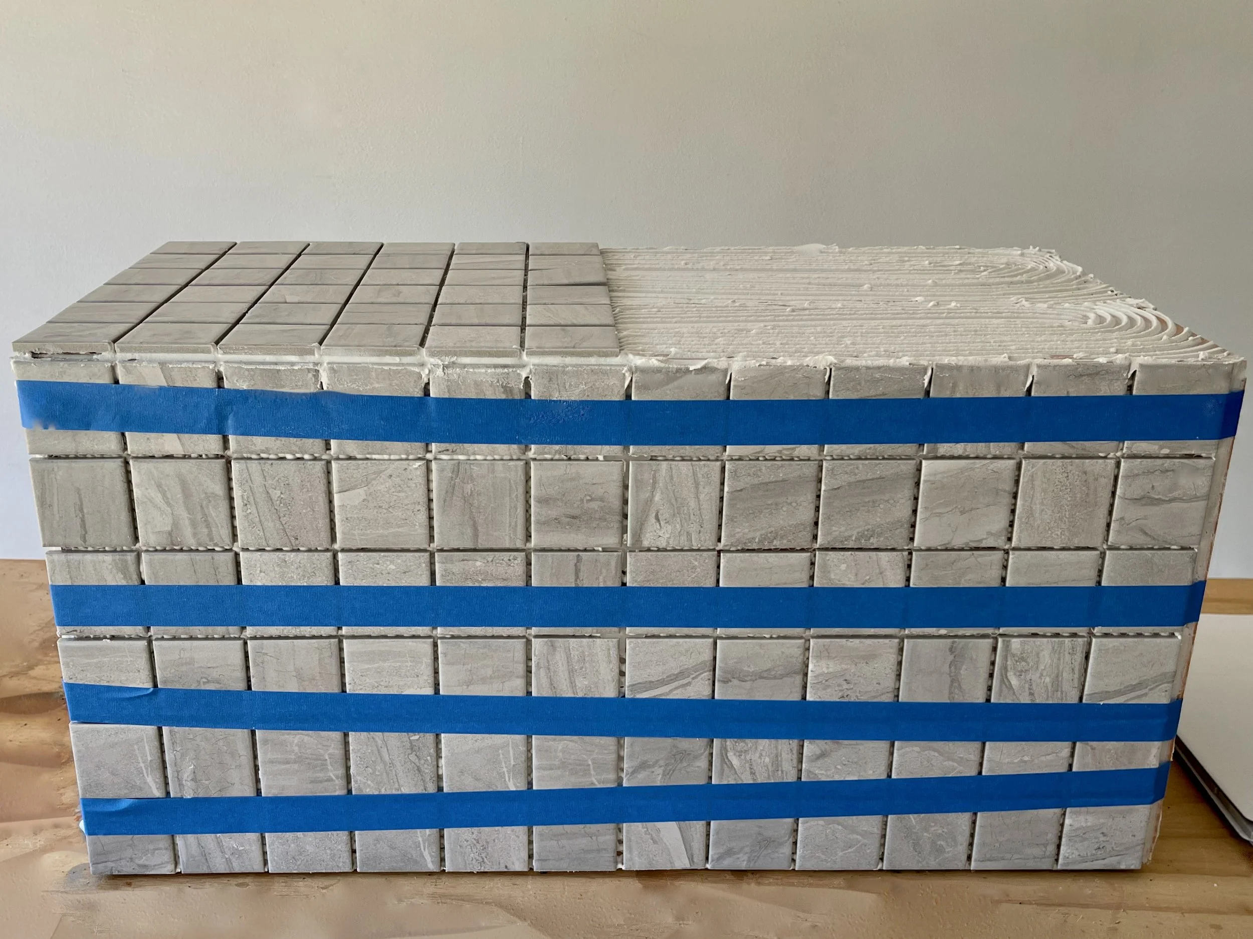 Working on one side at a time, I applied premixed tile adhesive and taped the mosaic sheets to hold them in position while it cured.