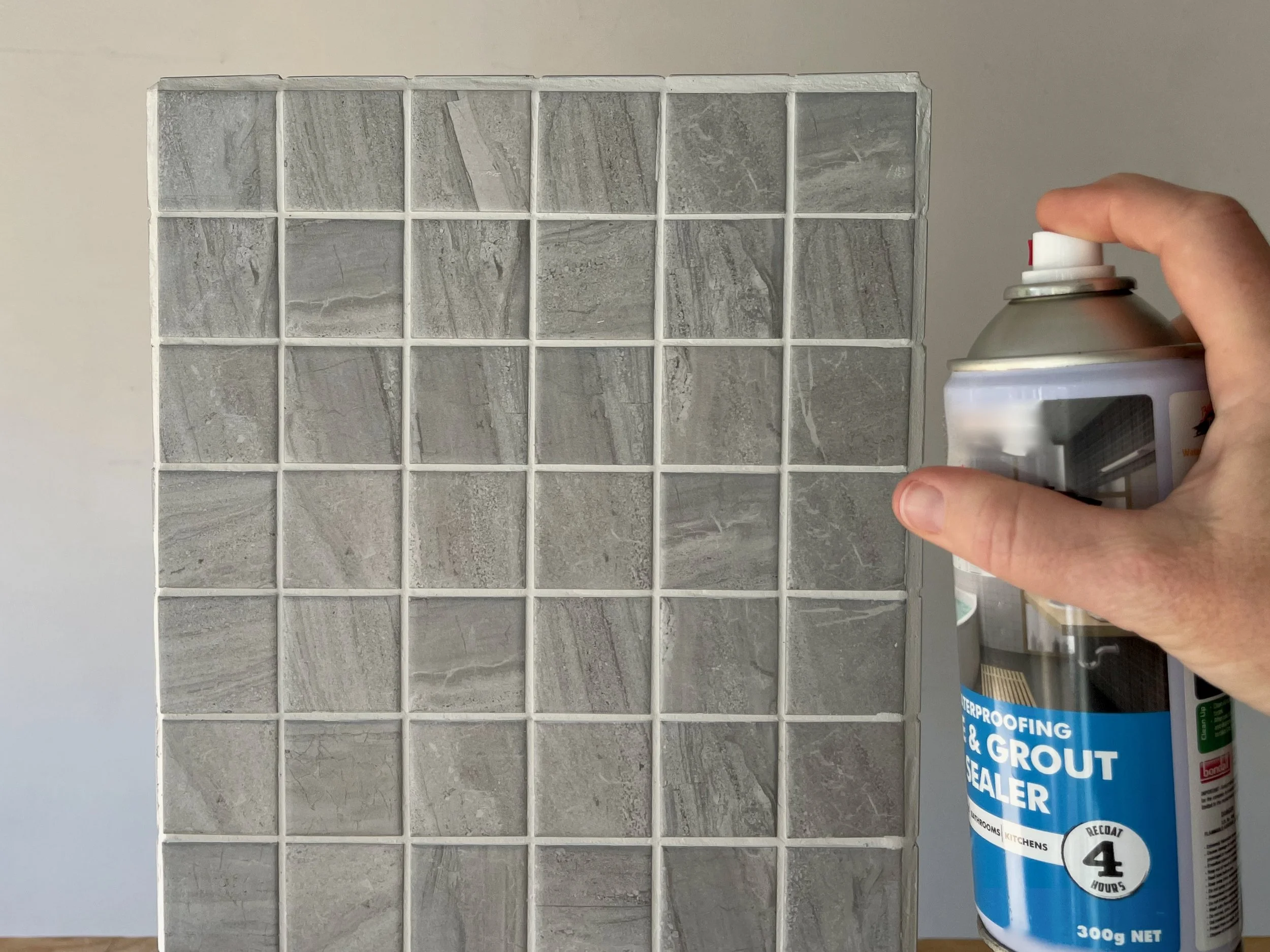 I used Decor8 Tiles 306mm-square Como Grigio porcelain mosaics in Grey with Dunlop premixed adhesive and white Ready-to-go grout to keep the process simple. Betta TileCare Tile & Grout Sealer in an aerosol can is in keeping with my aim to choose products that limit the mess.