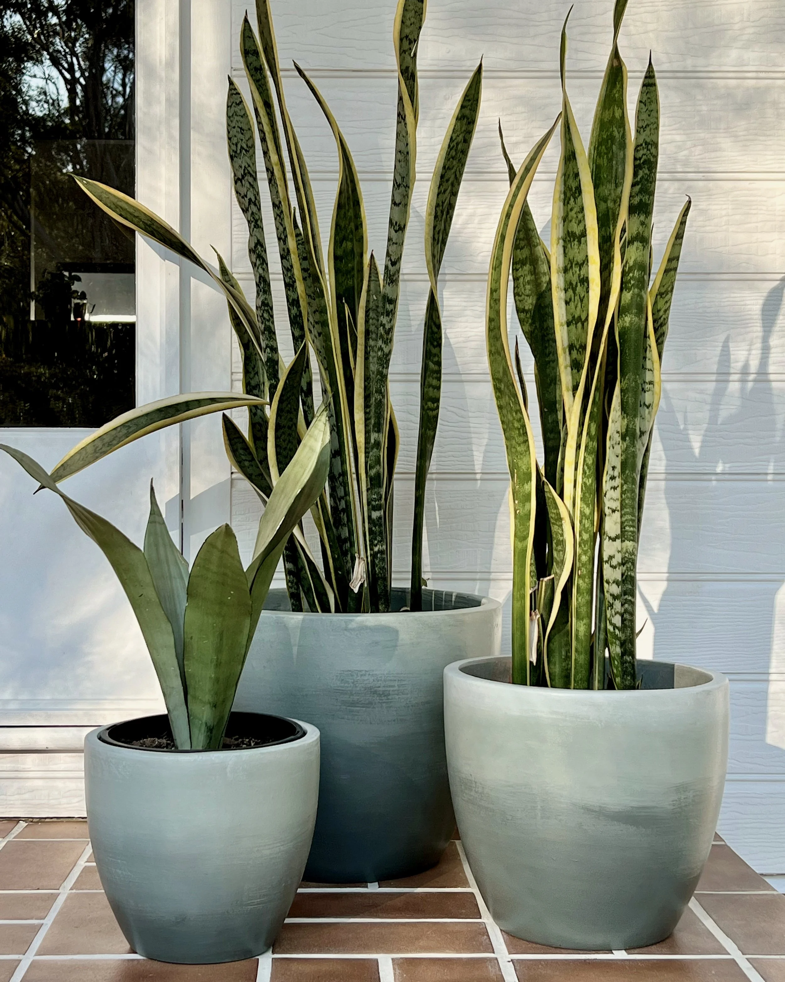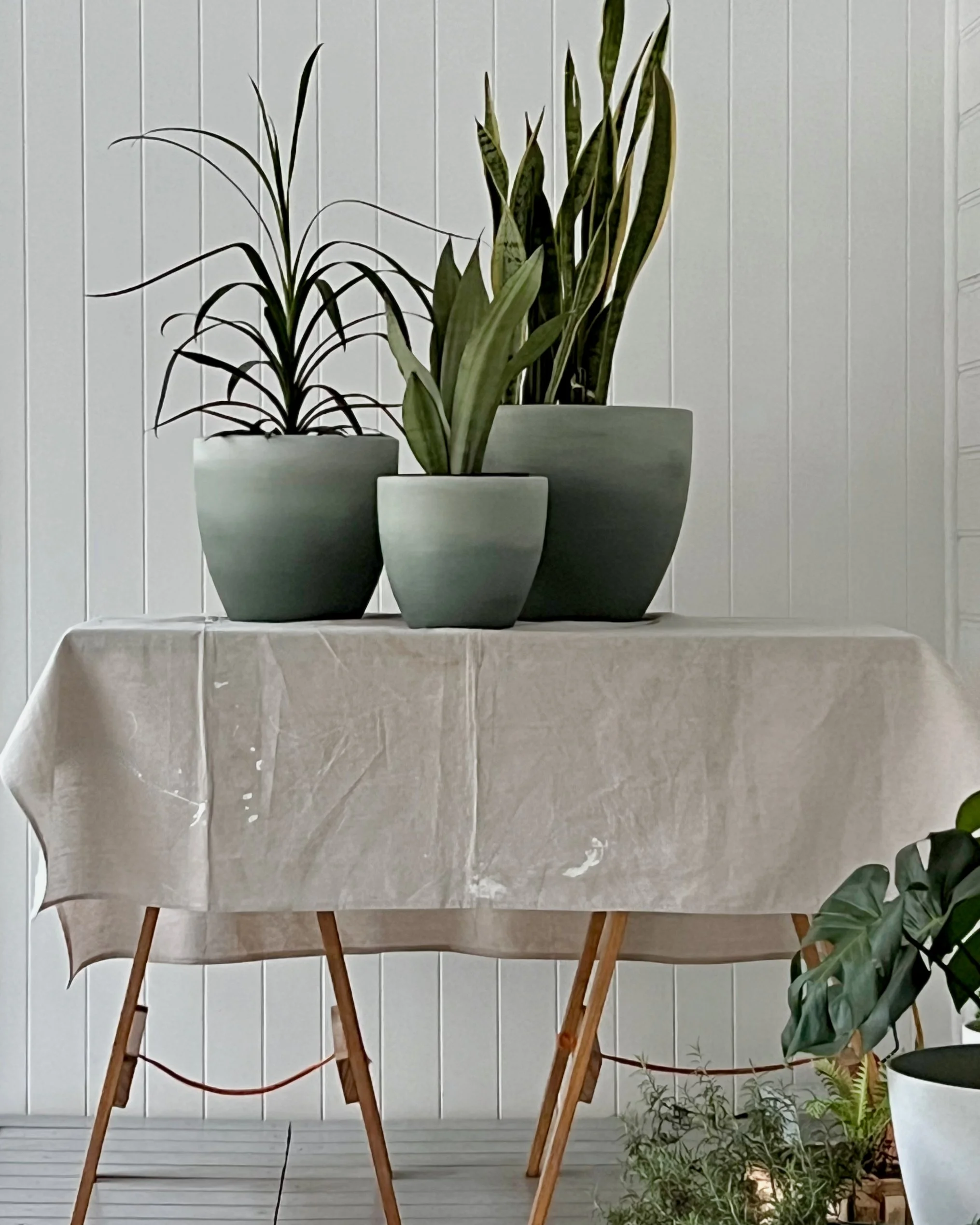 I picked up three sample pots of Porter's Paints in green-grey colours to spruce up a trio of Northcote Pottery egg-shaped pots. They’re cleaned, sealed, painted then sealed again to keep them looking good for longer.
