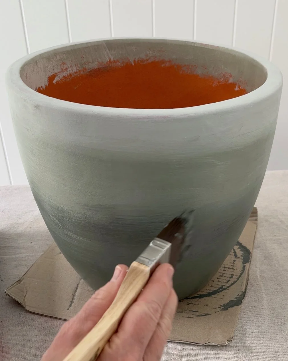 Then I brushed the darkest shade around the base of the pot to a third of the way up. I used a clean brush to apply a medium shade around the middle, then repeated for the lightest around the top and inside the lip, overlapping the sections slightly.