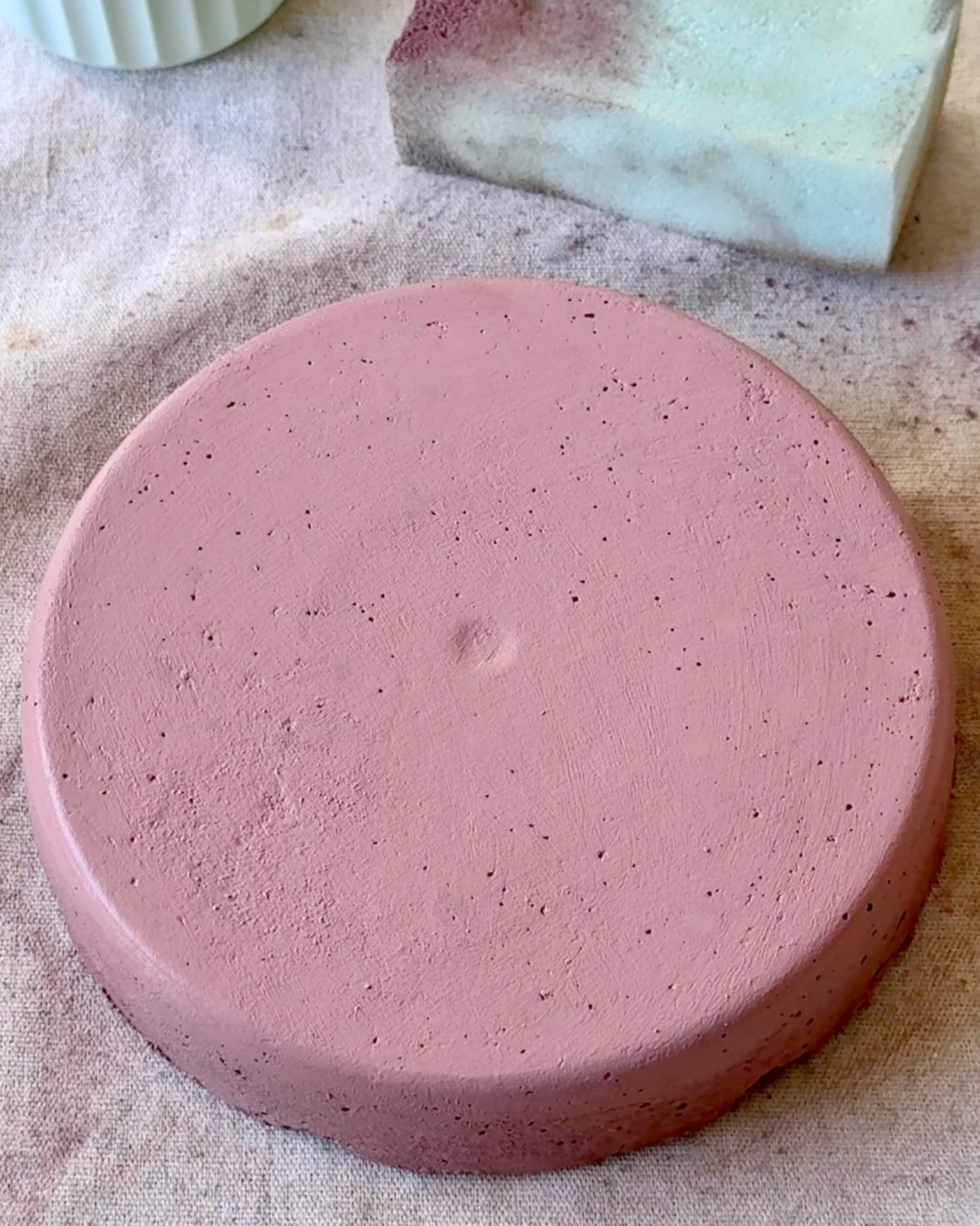 TIP The concrete shrinks slightly as it dries so should pop out of the bucket easily. Tap the base with your other hand if it needs a little help.