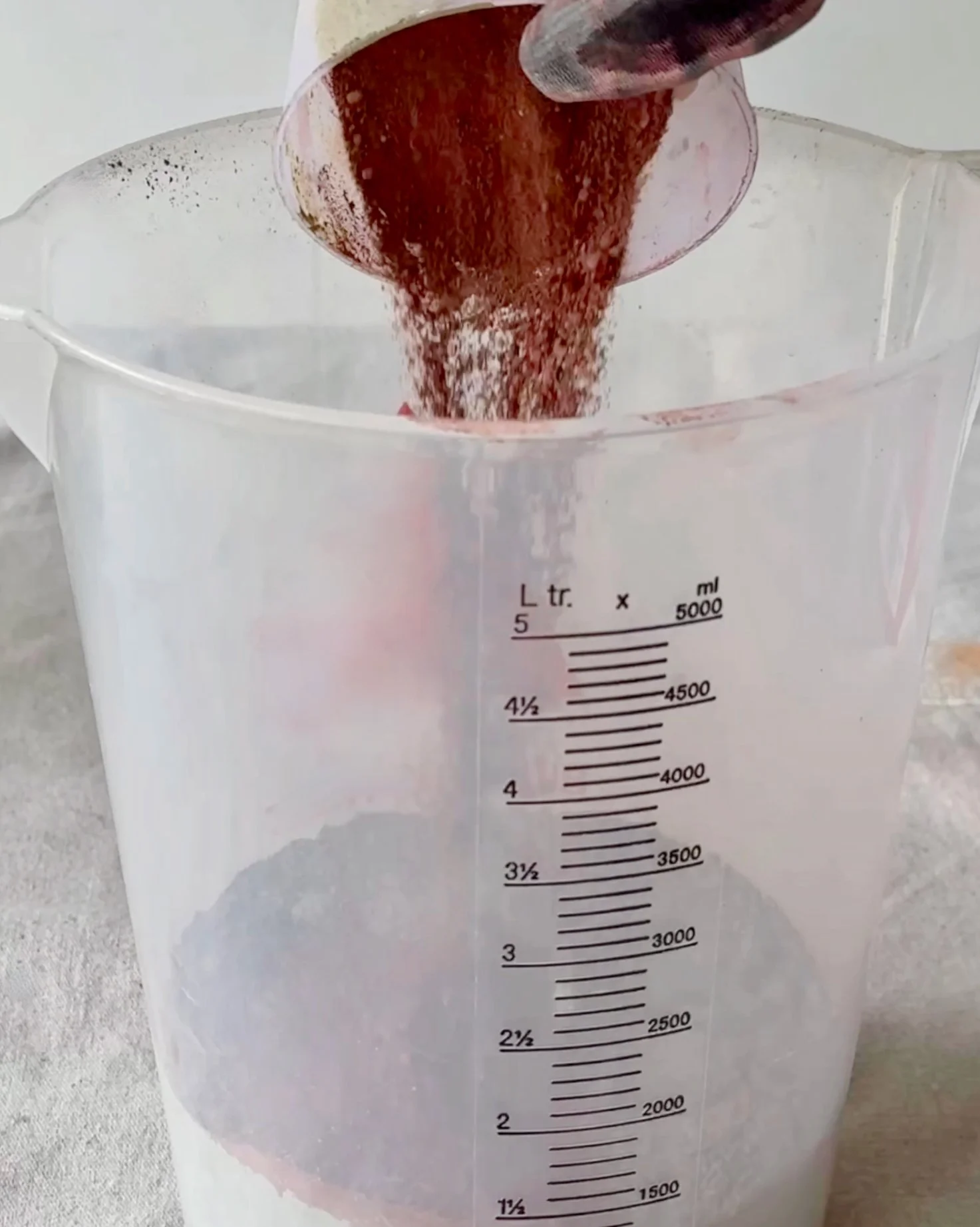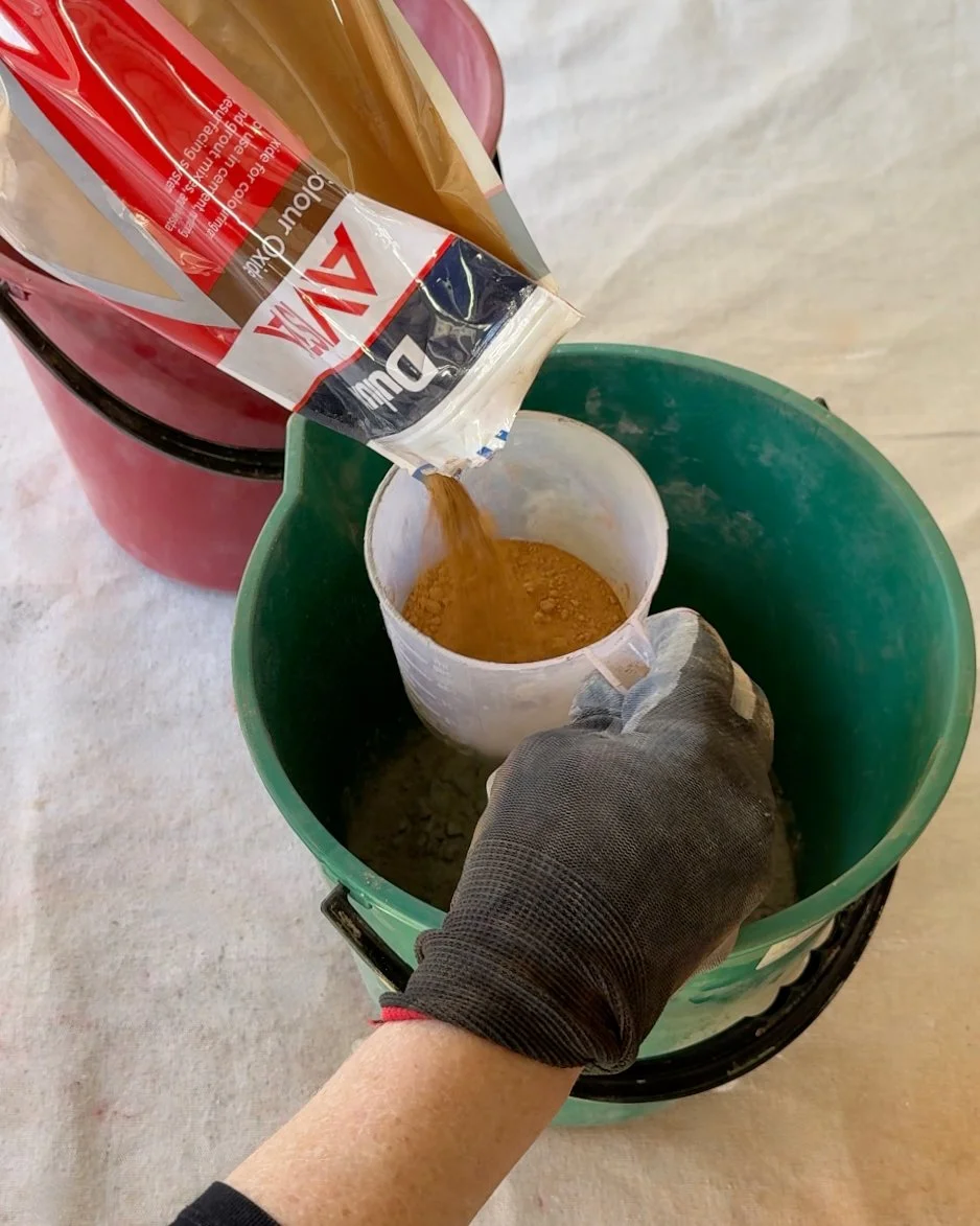 Into a bucket, measure 20 parts fast-set high-strength concrete (five cups) and one part coloured oxide (1/4 cup) and stir to combine.