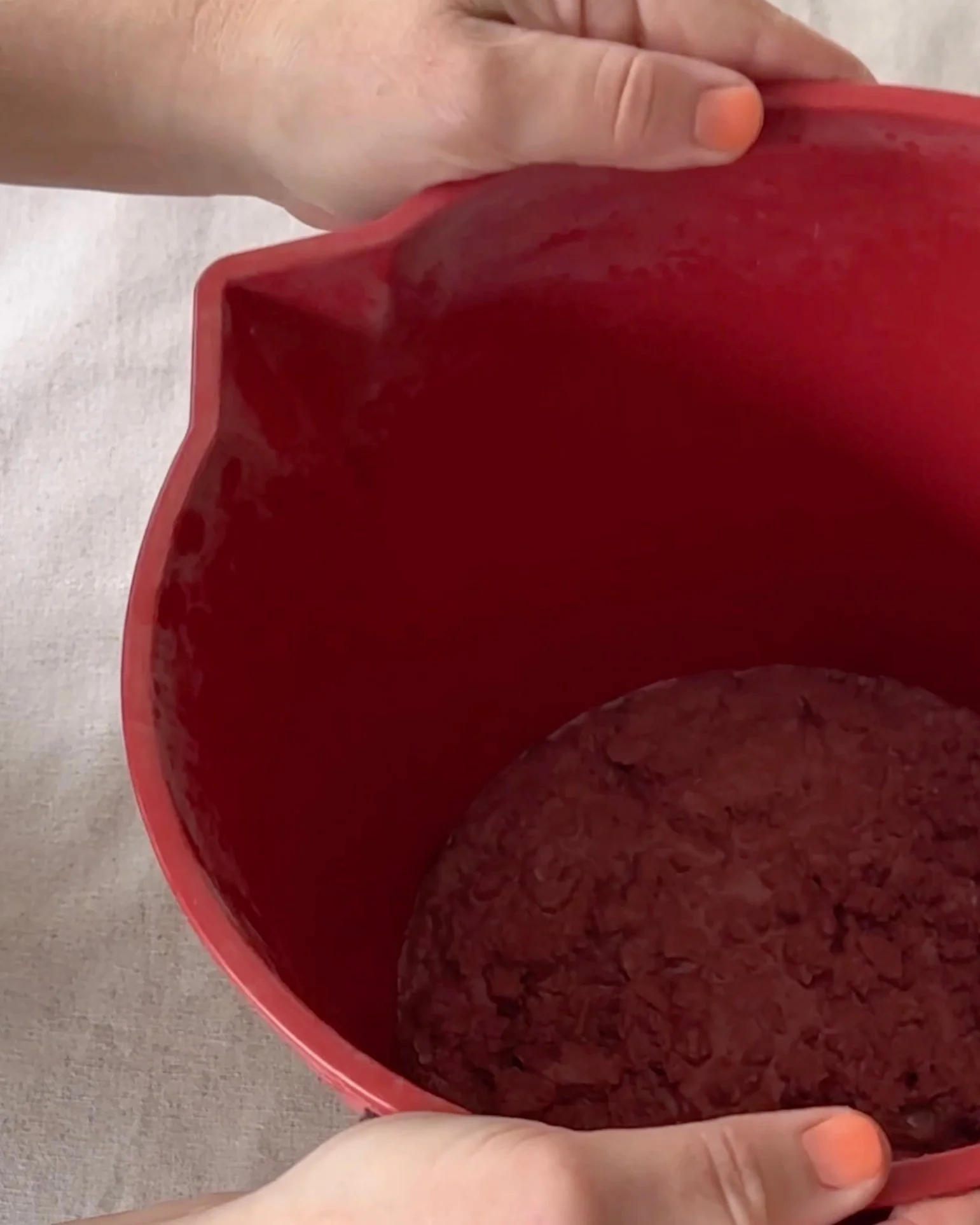 Spray lubricant into a clean bucket and pour out the excess. Drop in the mixture. Tap and shake the bucket for at least a minute to remove any air bubbles. Leave to cure for a couple of hours.