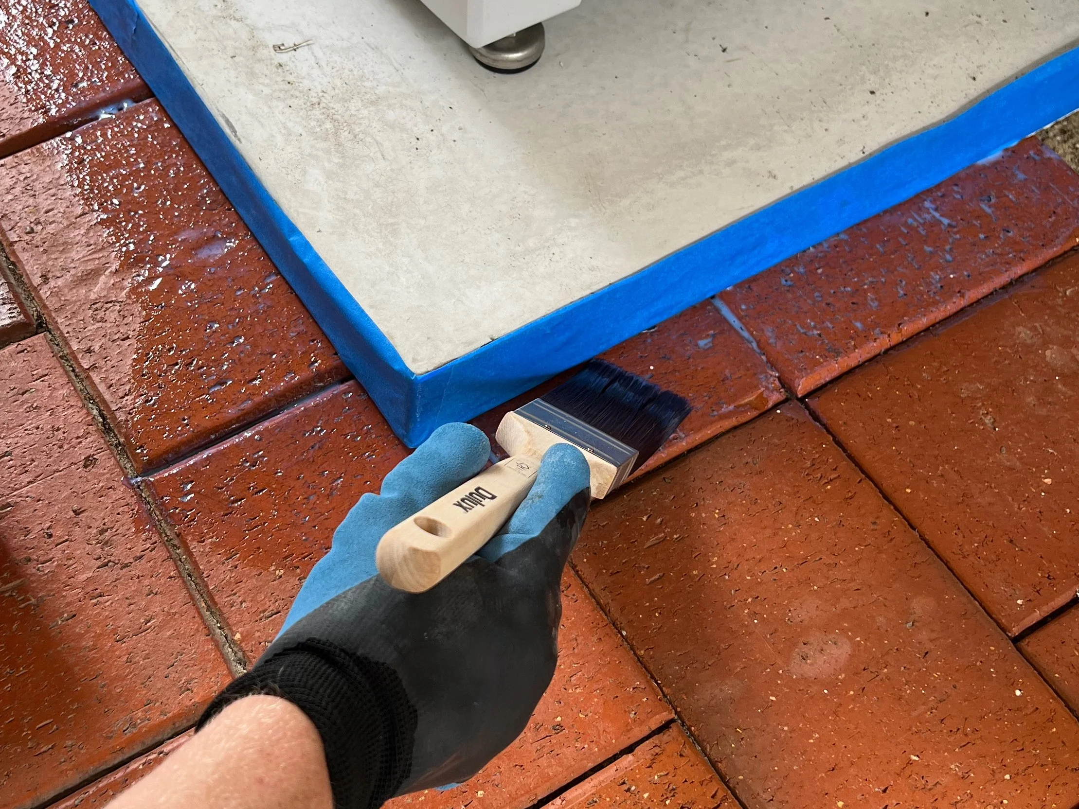 After stirring the tin of Dulux Concrete & Paving Coloured Sealer to ensure the colour and slip-resistant particles were evenly distributed, I checked my shoes were clean and free of grit before using the brush to cut in around the edges.