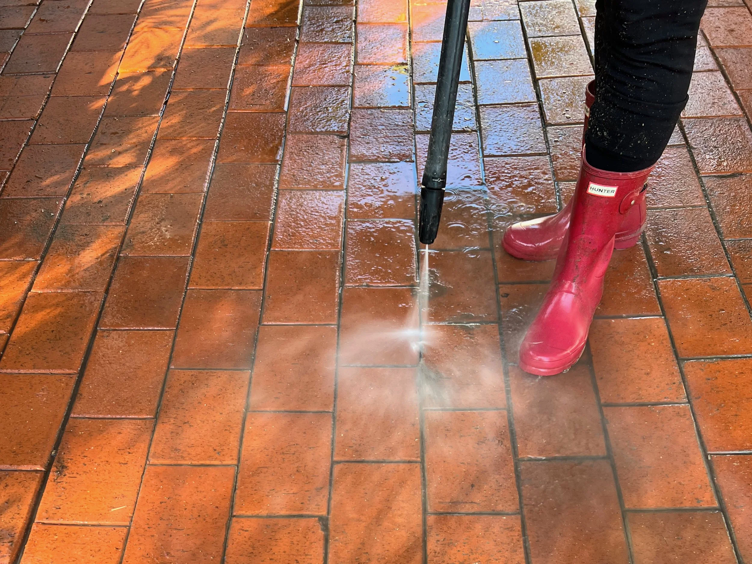 After sweeping with a broom, I pressure washed the pavers wearing boots and eye protection.