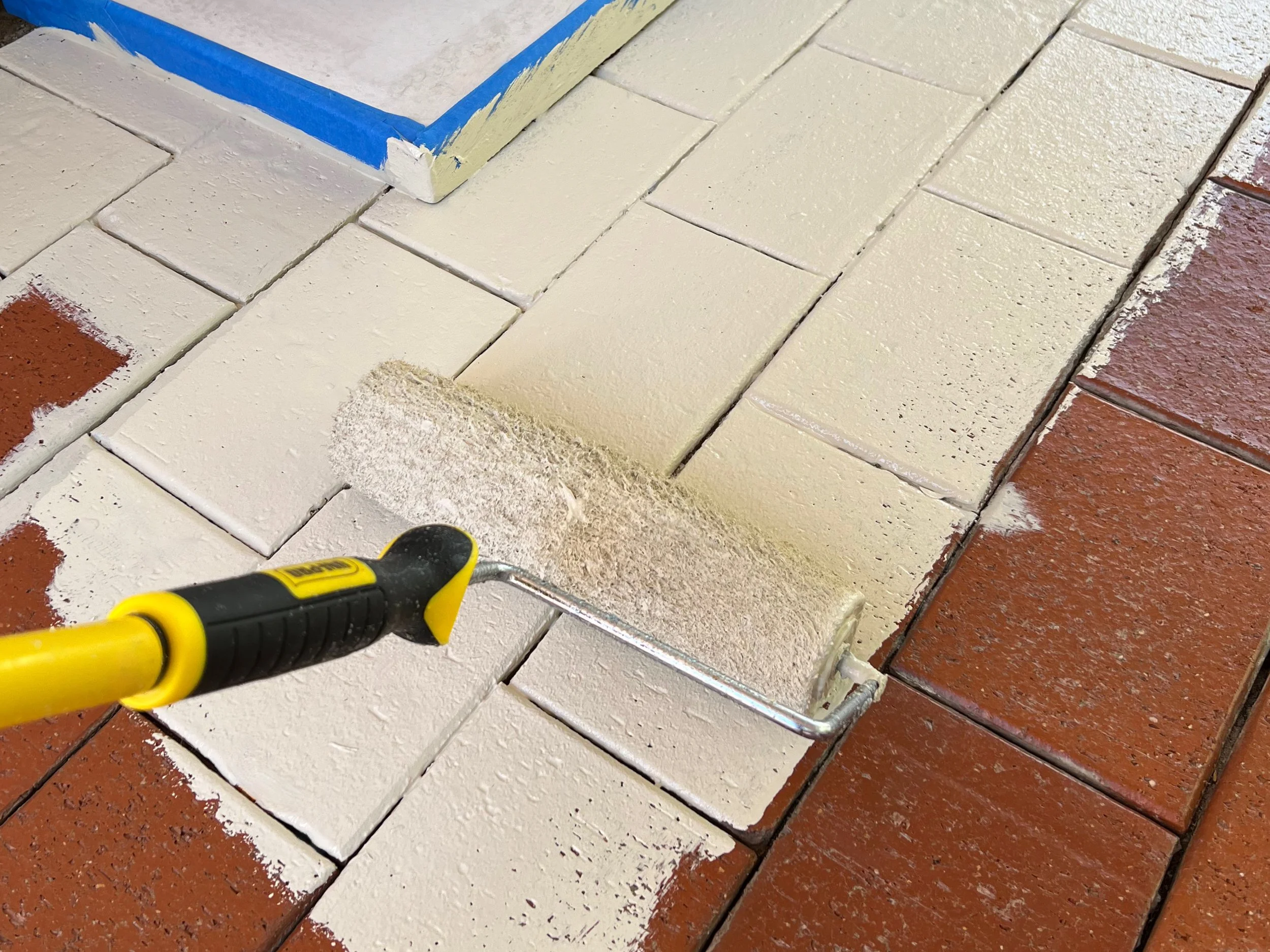 Then I used a clean long-nap roller to apply, working from end to end in slightly overlapped sections and rolling into the gaps between the pavers, and left it to dry for two hours.