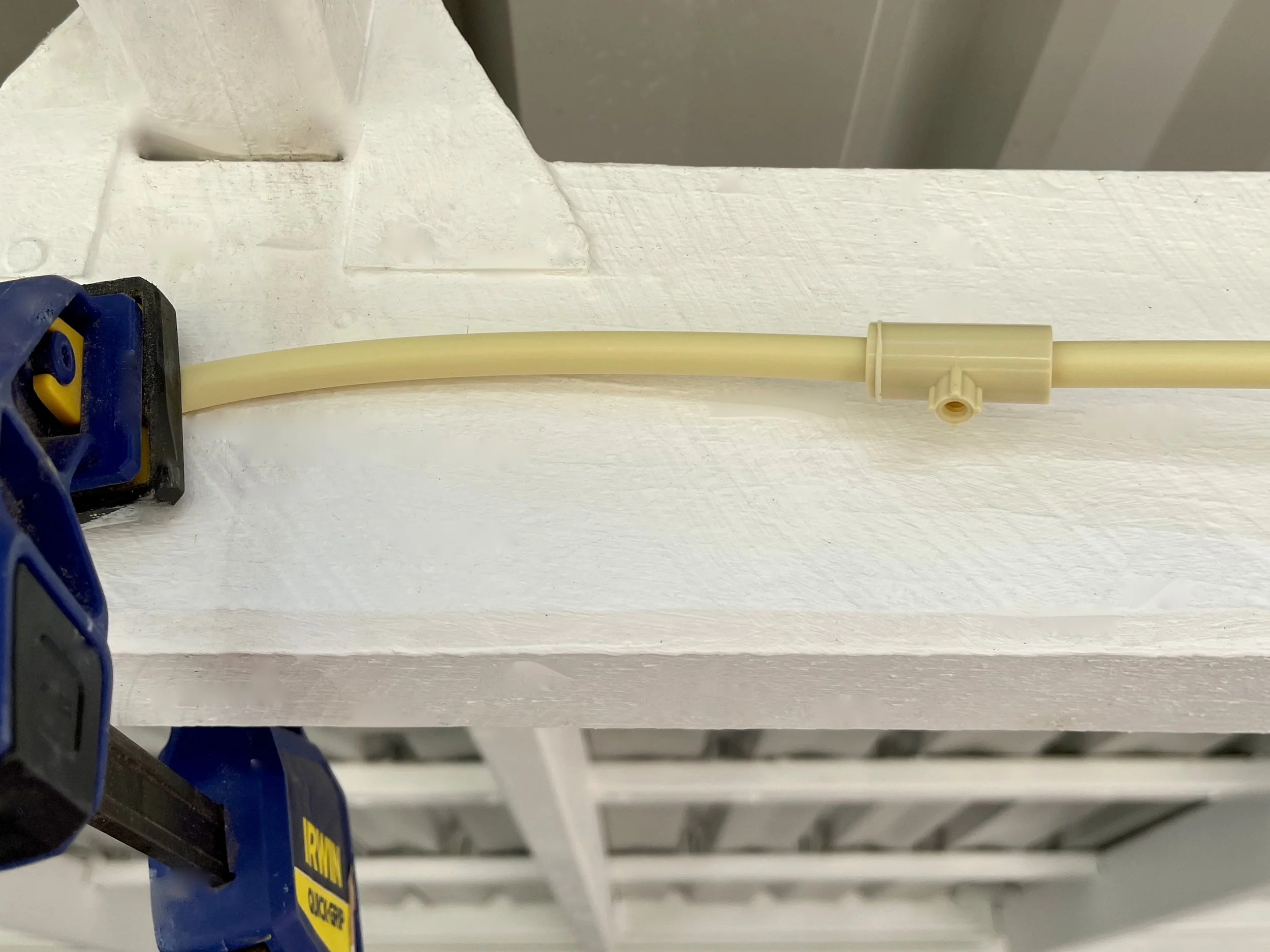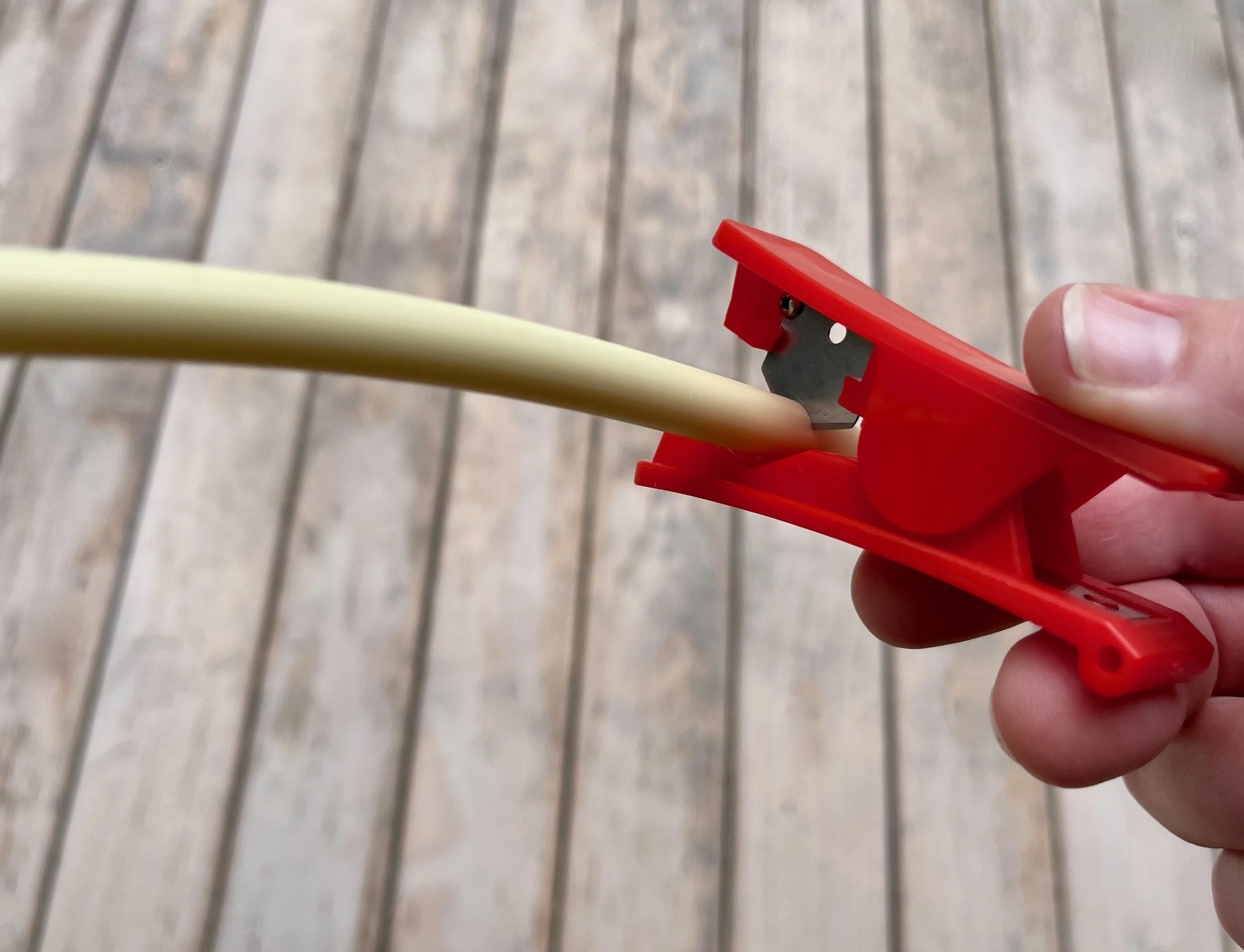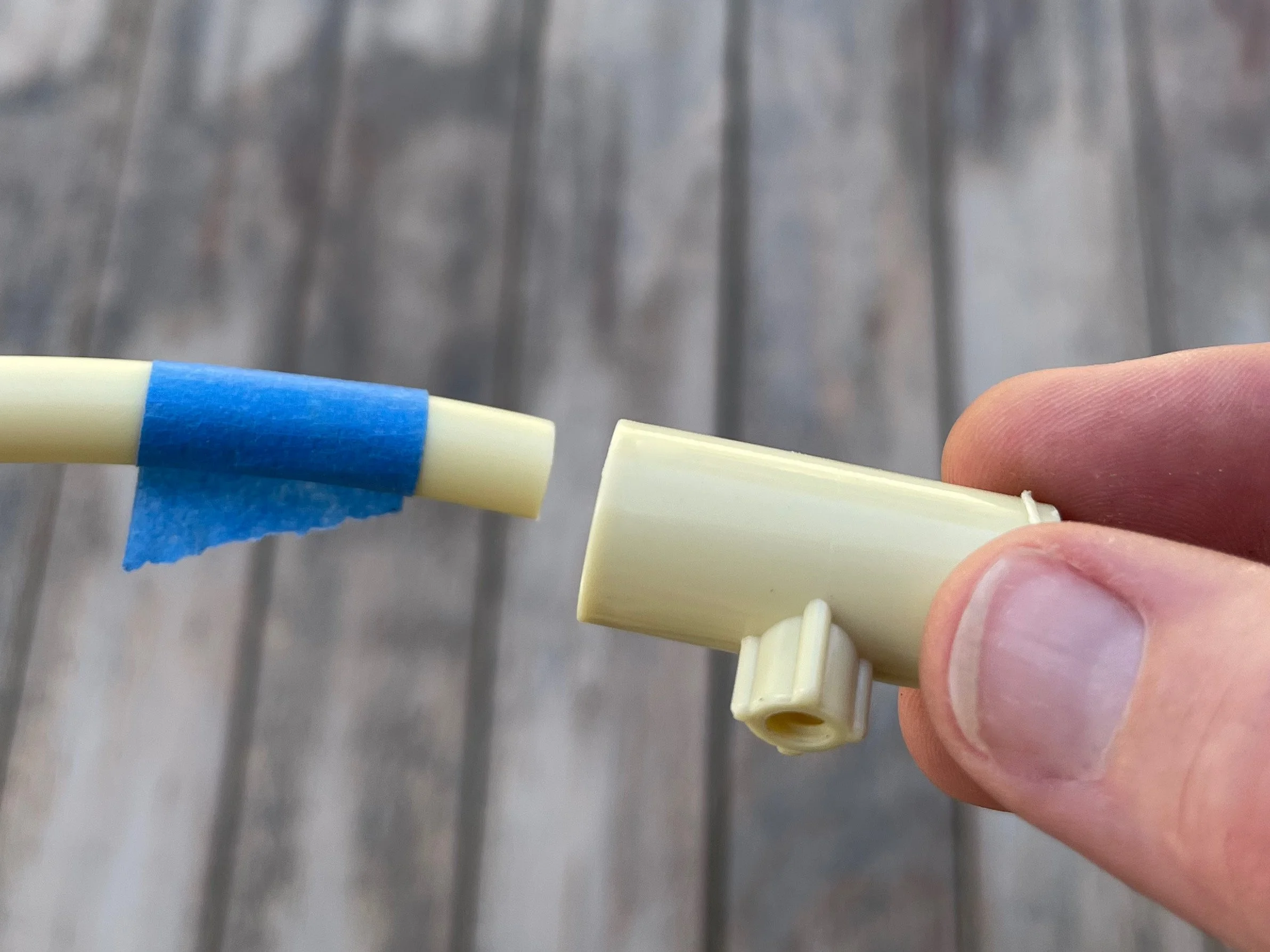 To fit each tee connector, I pushed it onto the pipe by 10mm, holding it straight and twisting slightly. Once the pipe is fitted, it grips firmly and can’t be removed, so I used tape as a marker to avoid pushing it in too far where it could obscure the water flow into the jet.