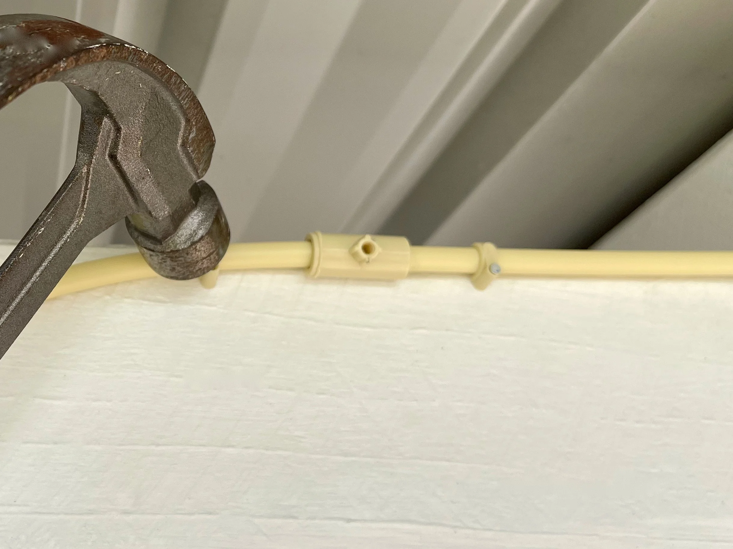 To attach the system to the beam, I stood on the step ladder to hammer the pipe clamps about 50mm both sides of each connector to hold them in place. I also tapped the clamps around the pipe along the wall and either side of the auto-drain valve near the tap.