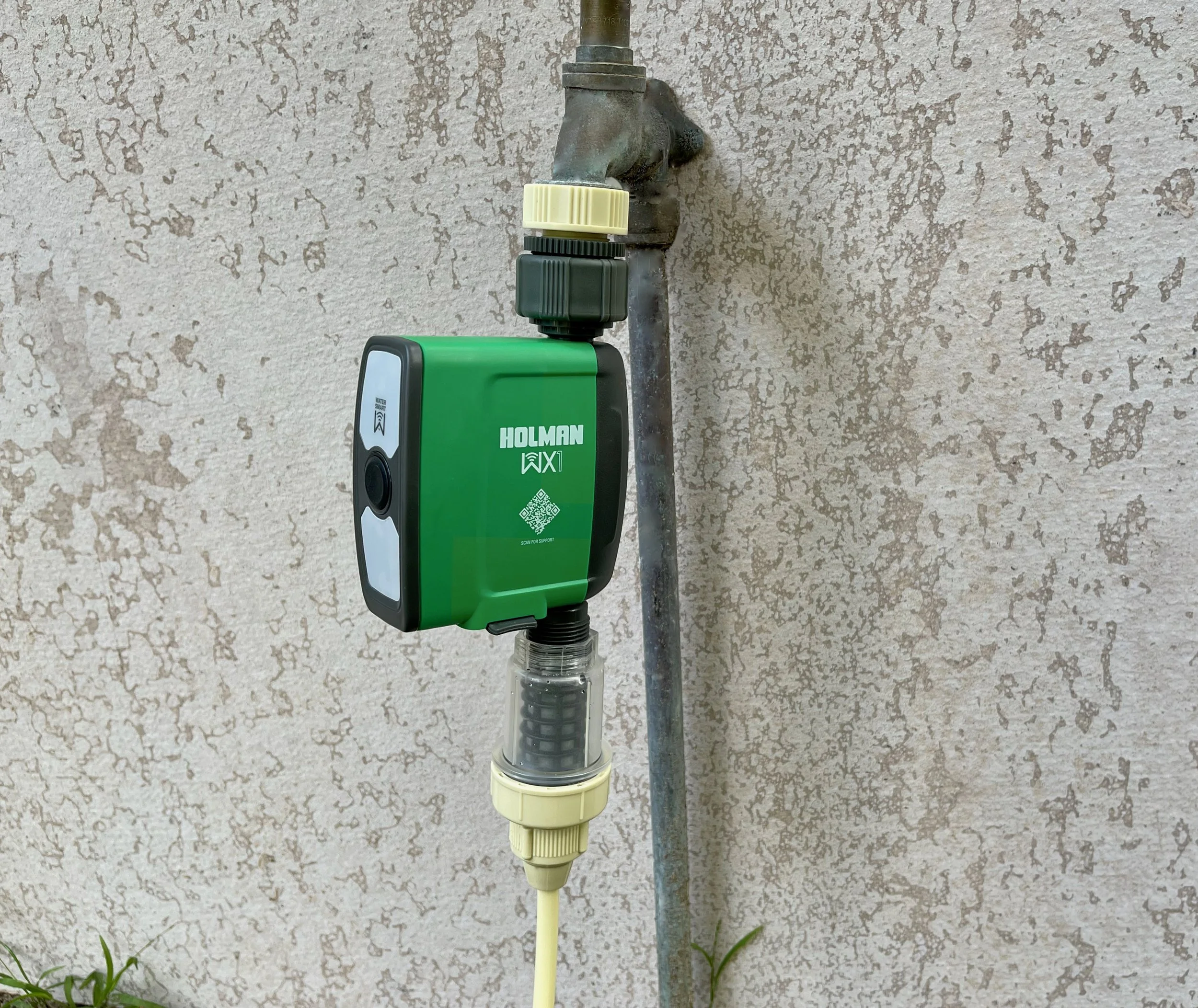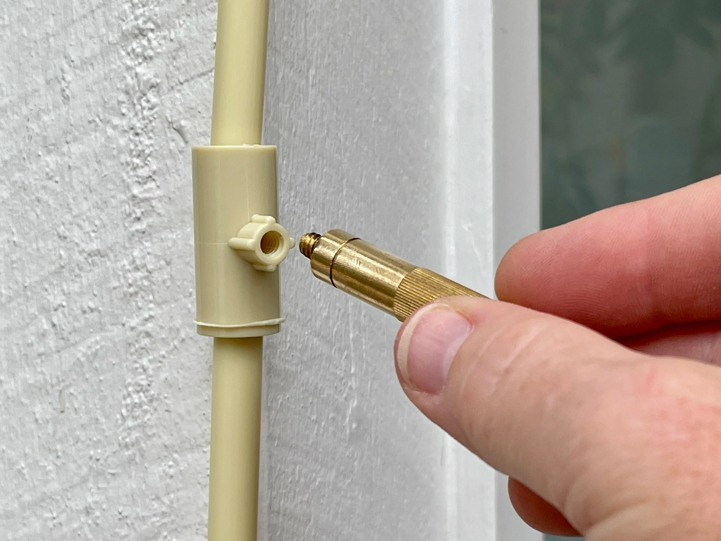 I screwed the misting filter into the base of the tap timer, then attached this assembly directly onto the tap using the supplied universal tap adaptor. I inserted one end of the pipe into the filter and tightened the attachment.