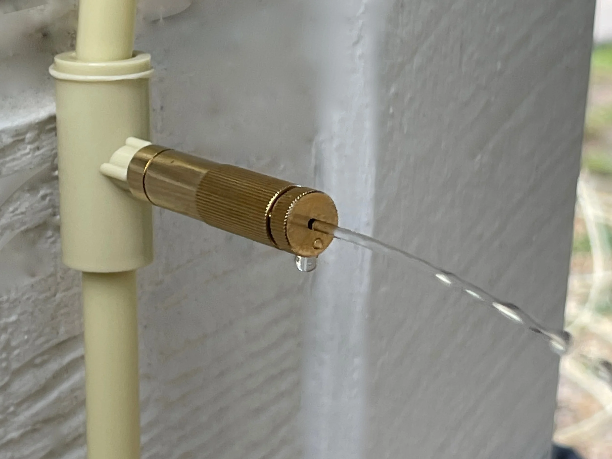 Tiny droplets of water lower the air temperature as they evaporate. They’re emitted from small brass jets attached to compression connectors, which are joined by short lengths of pipe. A longer length of pipe runs around the wall and joins to the garden tap.